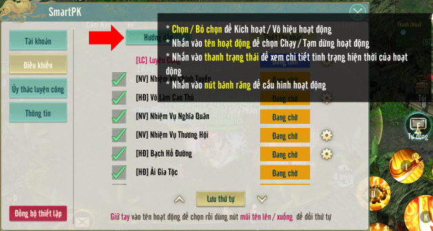 ❸ Lưu thứ tự: Lưu lại thứ tự ưu tiên sau khi các bạn đã sắp xếp thứ tự ưu tiên các hoạt động [LC] Luyện công, [HĐ] Hoạt động, [NV] Nhiệm vụ, [PB] Tổ đội…